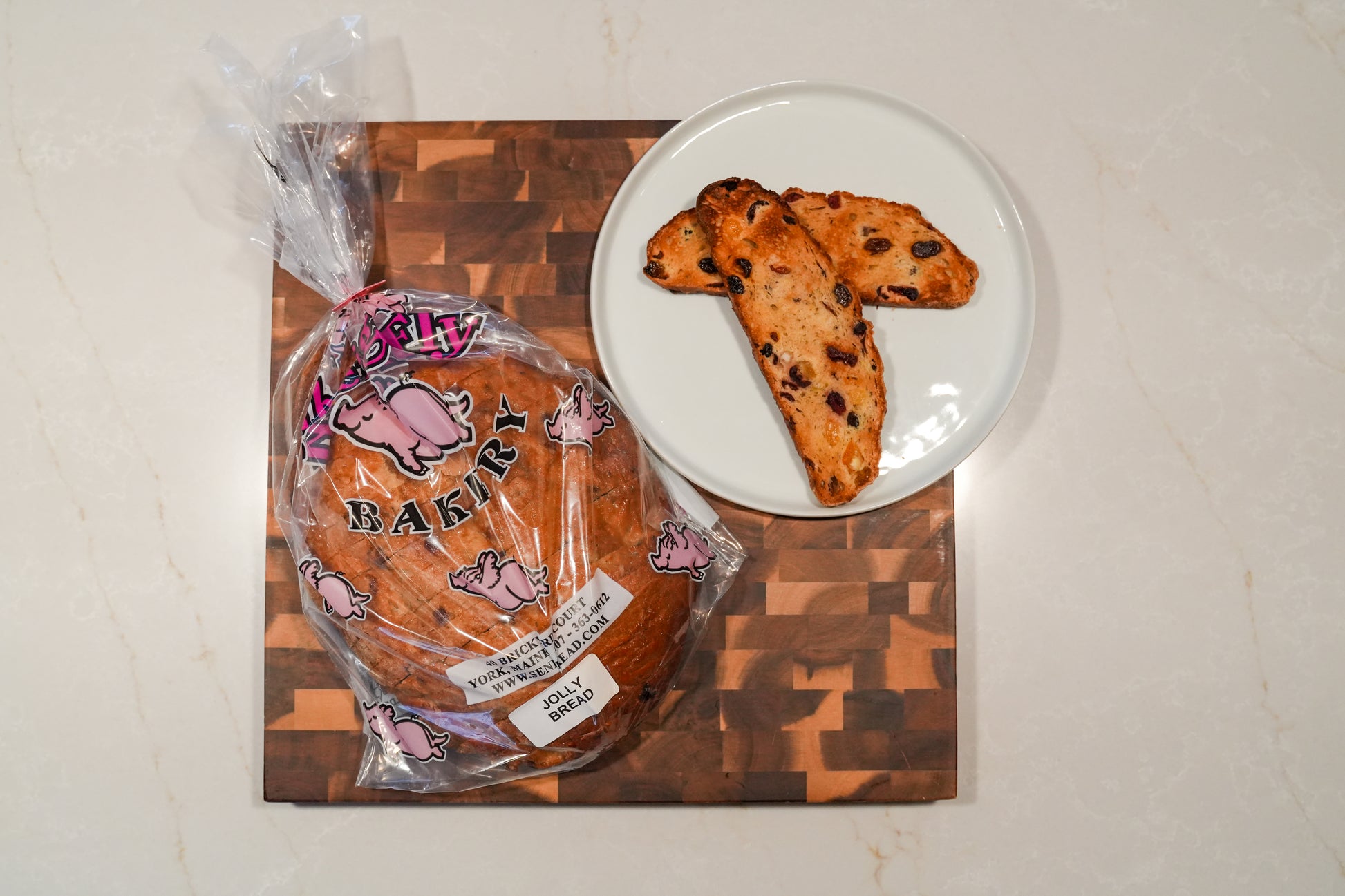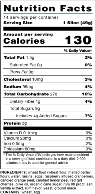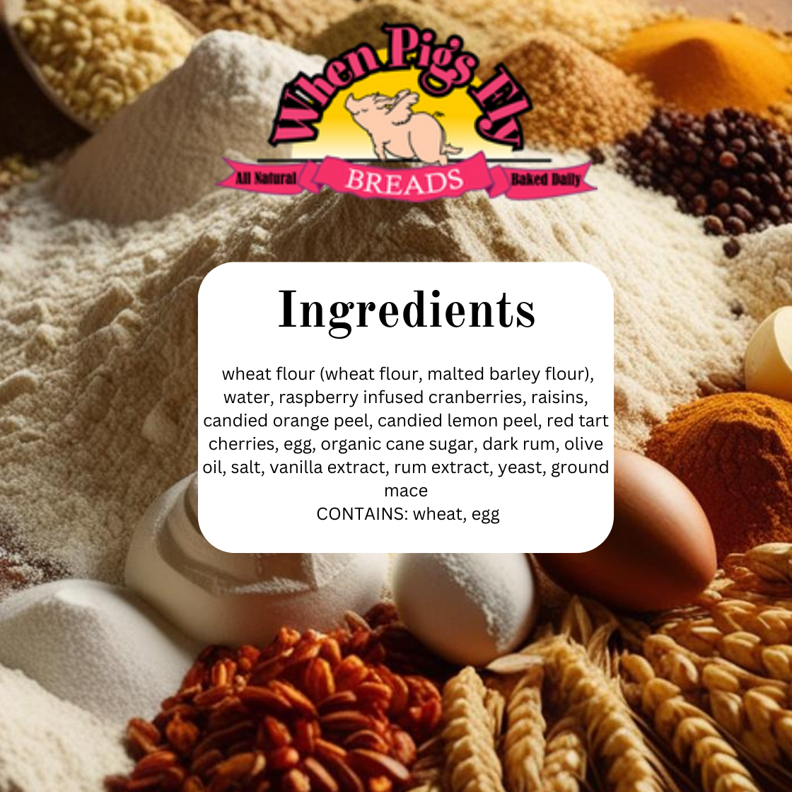 Happy Holidays! This new version of our much-loved Jingle Bread is sure to add to the holiday spirit with rum soaked dark and golden raisins, raspberry infused cranberries, candied lemon & orange peels, dried tart cherries, and holiday spices.